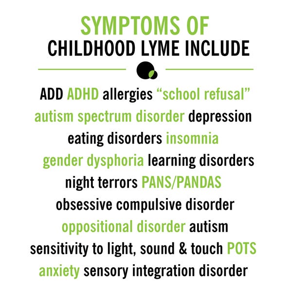 They all took long lifestyle interviews, too. They were aware that I grew up in tick-infested Westchester. They knew we had a summer house in the equally infested Hamptons. I had a dozen or more symptoms by the time I was growing babies in my womb including roving arthritis, Bell’s palsy, brain fog, and treatment resistant depression—but not one of my many doctors or the ones that went on to treat my children connected the dots.